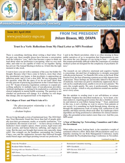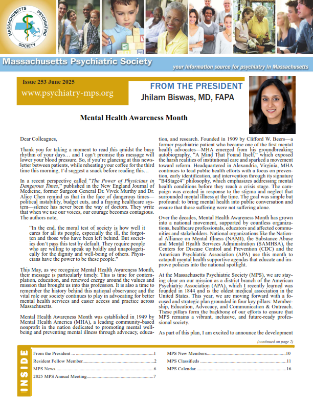 The Massachusetts Psychiatric Society (MPS) represents the majority of Psychiatrists in Massachusetts. MPS members are Physicians who are committed to providing outstanding medical/psychiatric care through accurate diagnosis and comprehensive treatment of mental health and emotional illnesses. We seek to achieve this goal by promoting public and professional education, legislation that addresses the needs and rights of the mentally and emotionally ill, and by advocating for the allocation of public and private resources for treatment, research, and education. We provide a supportive and informative professional community for our members.