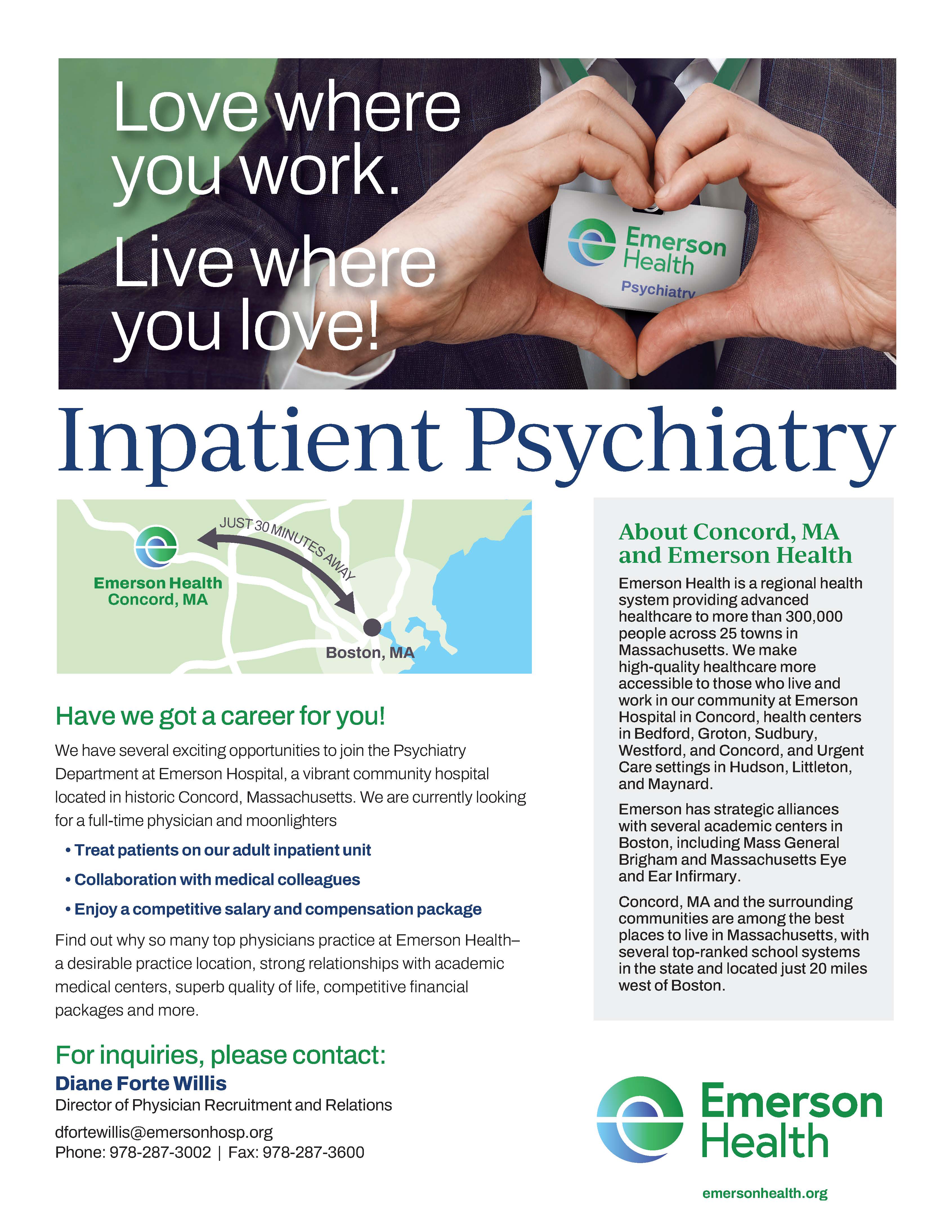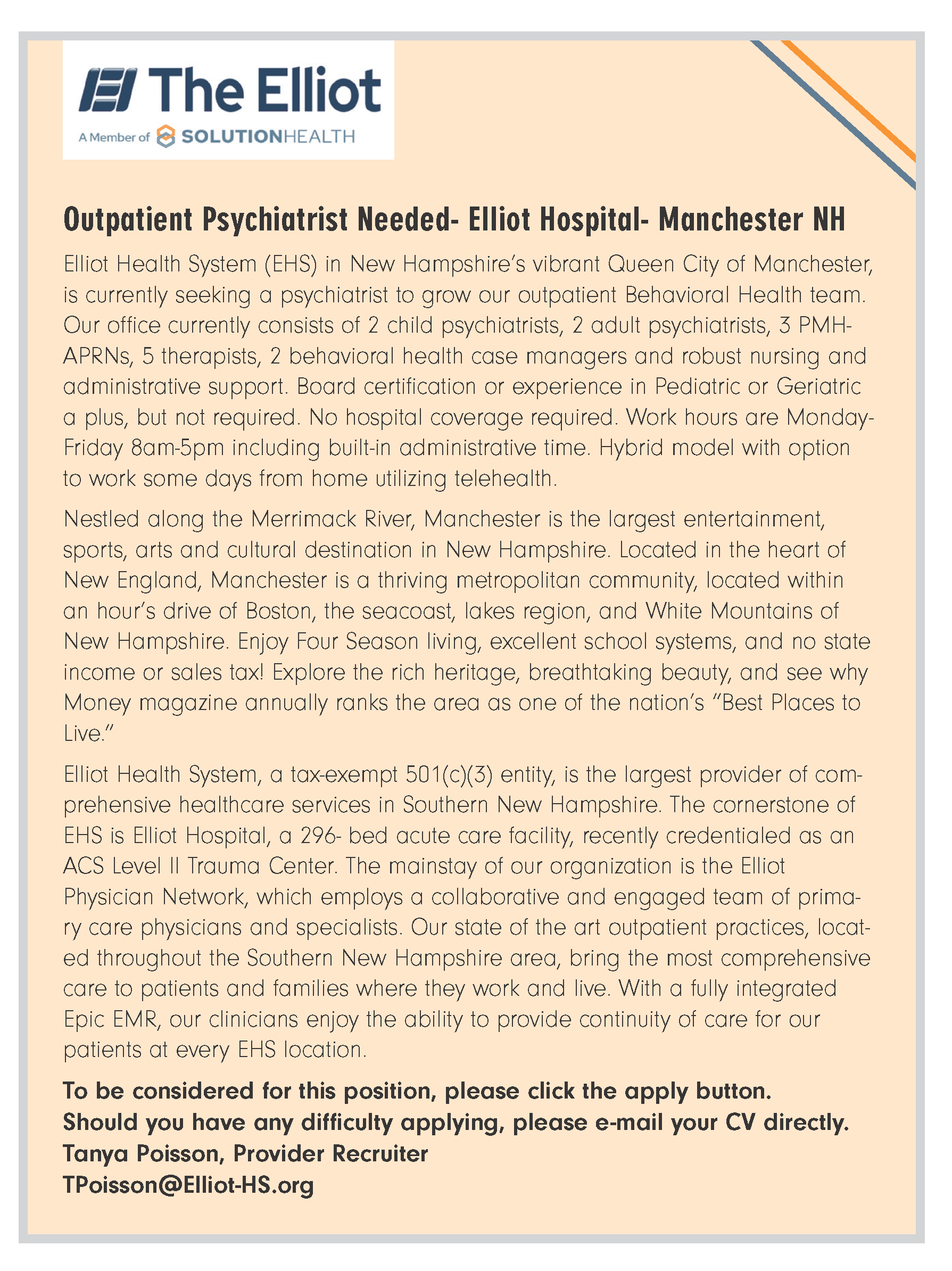PSYCHOLOGIST POSITIONS IN THE MASS GENERAL BRIGHAM ACADEMIC MEDICAL CENTER DEPARTMENT OF PSYCHIATRY The Mass General Brigham AMC Department of Psychiatry has outstanding opportunities for licensed psychologists in several practice settings. Part- and full-time positions are available in our outpatient clinics, in our inpatient psychiatry units, in our substance use disorder teams, in psychiatric and medical subspecialty outpatient groups, and in our neuropsychological assessment centers. Opportunities in our affiliated community health centers and rehabilitation hospital are also available. Psychologists provide clinical services including comprehensive diagnostic and neuropsychological evaluations and short-term, evidence-based treatment. We are seeking psychologists with generalist training adept at diagnosing and treating a variety of mental health conditions. Individuals with training in cognitive behavioral therapy and other evidence-based treatments are encouraged to apply. Candidates who work well in teams, collaborate well with medical colleagues, thrive in a fast-paced work environment, and enjoy consultation and evaluation will be particularly well suited for this work. In addition to clinical work, there are teaching and research opportunities at Mass General Brigham and Harvard Medical School (HMS) for the appropriate interested candidate. Qualified applicants may apply for a faculty appointment at HMS at the rank of Instructor, Assistant Professor, or Associate Professor. Candidates should have a Ph.D. or a Psy.D. in clinical or counseling psychology from an APA/CPA accredited program and must have completed an APA accredited internship. Candidates should be licensed or license-eligible in Massachusetts. Interested individuals should send a cover letter and CV to [email protected]. We are an equal opportunity employer and women, and minorities are highly encouraged to apply. All qualified applicants will receive consideration for employment without regard to race, ethnicity, religion, sex, national origin, disability status, protected veteran status, gender identity, sexual orientation, pregnancy and pregnancy-related conditions, or any other characteristic protected by law.